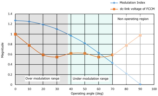 At = 0, a 27% maximum modulation index is achieved which results in the higher output voltage of the proposed converter. Figure 12 shows the over modulation range along with the dc-link voltage required for harmonic compensation. When the theta lies between degree, maximum seven-level output voltage is achieved which will lower the current value for the same power rating of the converter.