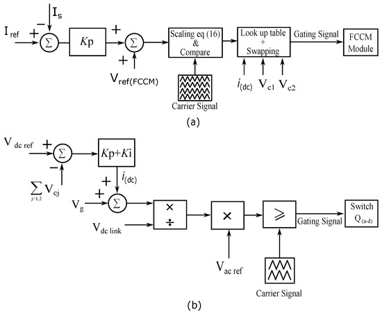 Figure 13a, shows a current control loop, in which an error signal is achieved by comparison of measured current and which is further compensated by a proportional gain and then added in the modulating signal for the FCCM converter. The dc link voltage variation impact in the current is minimized through dc voltage feed forward loop control by adjusting the PWM accordingly as described in Equation (16):