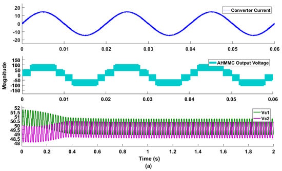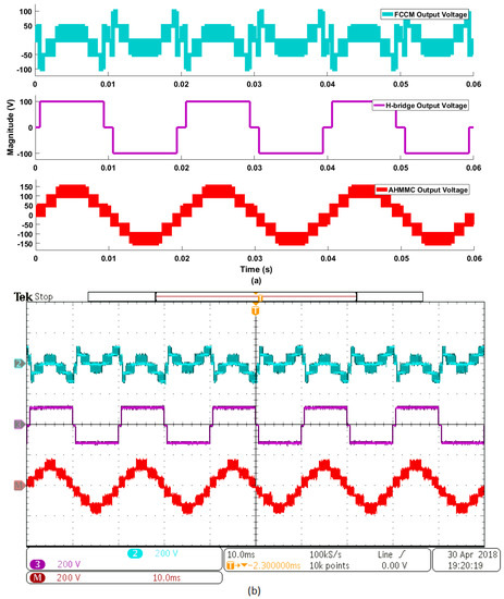 Figure 15 depicts the simulation and practical results of the AHMMC converter output voltage at m = 0.89. The two angles per quarter cycle operation gives an output of five-level. Figure 15a shows simulation results, whereas Figure 15b shows experimental results of the stable converter operation due to the balanced dc-link capacitor voltages. The situation is similar when an active power is transferred by compensating the harmonics produced by the H-bridge through series active filter (FCCM).