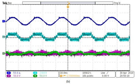 AHMMC converter output, (a) simulation validation of capacitor voltage balancing togather with a unity power factor, and (b) experimental validation, traces channels 1, 3, 4 (50 V/div), and 2 (200 V/div).