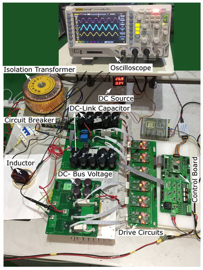The AHMMC converter is simulated in MATLAB/Simulink environment to demonstrate the system’s effectiveness, and performance of the modulation and control scheme. The AHMMC converter is designed for lower medium voltage application, hence efficiency greater then 97% is expected. However, an experimental validation is performed at low voltage laboratory prototype in which the proposed converter efficiency is determined by conduction losses of the semiconductor switches, which is not a very good indicator of real power losses appearing on the system, operating at a voltage range greater than 1 KV. To verify the system results, simulation results are scaled accordingly to a low voltage laboratory prototype using the system’s parameters presented in Table 6, which are the same for both simulation and experimental models. The selection of all component values has been done by extensive simulations. The criteria for capacitors selection are based on the voltage ripple and stability consideration of a converter i.e., the capacitor capacity should be high enough to withstand imbalance to a couple of cycles. Through simulation analysis, approximately 2% capacitor ripple is designed, whereas the inductor L value is selected for a current ripple of 0.5% (peak to peak) under full rated current.