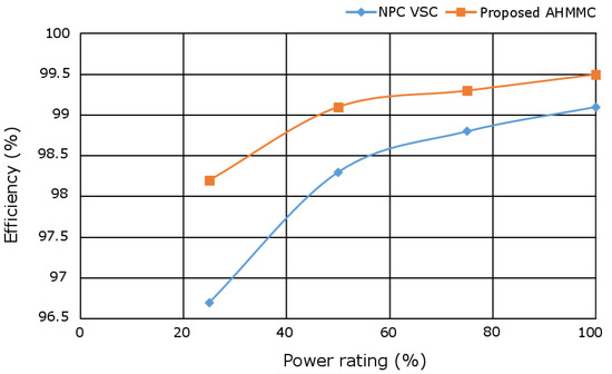 The proposed converter topology is designed for a lower medium voltage range up-to 5 kV with the maximum output voltage of seven-level. Considering the same system parameters, the proposed topology has certain advantages over other hybrid converter topologies, for example, the wide operating rang, low current THD presented in Table 11, and the lower component count in comparison with the hybrid converter topologies listed in Table 8. The switching losses are addressed by operating the high stressed switch with low switching frequency; the switching loss of the proposed converter is lower which results in higher efficiency in comparison with NPC VSC as shown in Figure 19 based on the converter parameters given in Table 9. However, the current THD of the NPC converter is less than the AHMMC converter.