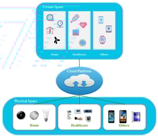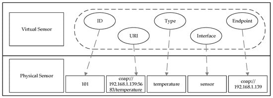 The mapping physical sensors to virtual sensors on the Cloud-based platform is described in Figure 2. We describe virtual sensors in order to enable the users to use sensors without any concern about considerations like specifications or location of physical sensors. The virtual sensors are used to encapsulate the basic attributes and behaviors of their corresponding physical counterparts in the physical space. The physical space consists of various IoT devices across different application domains such as smart home, healthcare, etc. These devices have the ability to perform actions according to commands from the virtual space. For each device, a device profile is preserved, which contains the properties (ID, URI, location, etc.) of the device and the basic action offered by the service. The profiles are stored by the cloud platform for further processing, as in other previous platforms. This platform provides various visual interfaces that provide better understanding of virtual sensors and enable the end users to manipulate IoT devices associated with the platform in an intuitive way, thereby reducing the burden under the premise of performing some actions on the physical sensors.