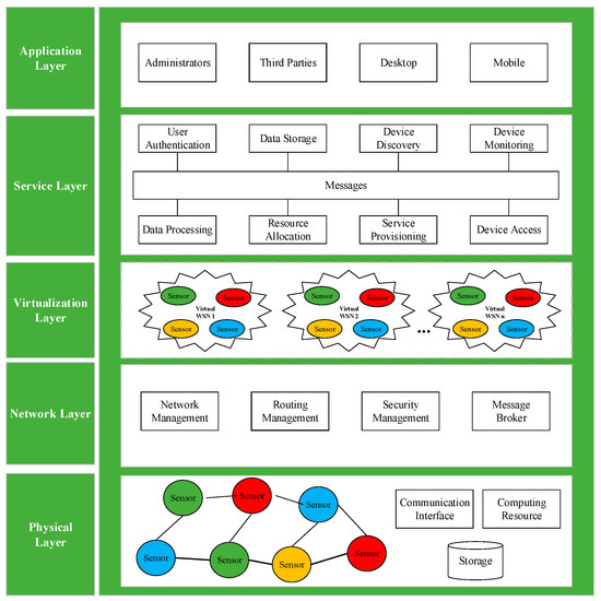 - Khan, I.; Belqasmi, F.; Glitho, R.; Crespi, N. A multi-layer architecture for wireless sensor network virtualization. In Proceedings of the 6th Joint IFIP Wireless and Mobile Networking Conference (WMNC), Dubai, UAE, 23–25 April 2013. [Google Scholar]