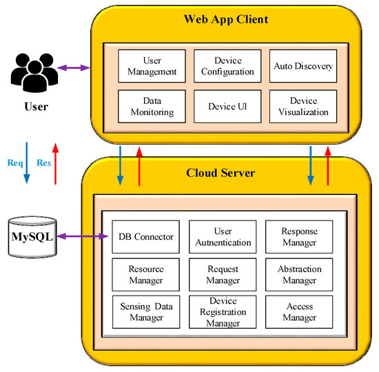 Figure 6 represents the detailed functional configuration of the cloud-based web application for preserving the profiles of physical sensors. This application is deployed on the Amazon Elastic Compute Cloud (Amazon EC2) in the Amazon Web Services (AWS) cloud. The cloud plays a simple role in the proposed platform by providing a repository of profile information associated with the linked physical sensors through a more user-friendly way. Thus, exploiting a fully developed cloud platform such as AWS or Azure will be seen as overqualified [63]. The user authentication allows the system to verify the identity of all users accessing to the network resources. The resource manager hosts the resource descriptions of physical sensors and provides the functionalities to register, maintain, lookup and remove these descriptions. The DB connector provides interfaces to connect to the database and allows to run Create, Read, Update, and Delete (CRUD) procedures on the database. The resource information which contains web links to all resources is stored in the MySQL database. The abstraction manager prepares the abstract for presenting virtual resource information in a template, and this template will be released to the app client whenever the user builds the request. The access manager is responsible for network communication with physical sensors. This module is implemented in RESTful style, which is flexible enough to adapt to other communication protocols, and is not limited to a single protocol such as HTTP. The device registration manager processes the incoming device information while the sensing data manager handles the sensing data from the physical sensors. The request manager is capable of receiving and handling the request from the client. It decouples the attributes from the request in order to discover the appropriate action based on the URI requested. The response manager generates the response based on the request and converts the data in the form which the client can understand. The client provides various interfaces such as user login and registration, device configuration, and device visualization. Physical sensors can be visualized whenever a new device is connected to the system. In addition, the cloud provides a unique interface for every virtual sensor, through which the end user can monitor the state of the sensor, and consequently the physical sensor can be easily controlled through the visual interface even though the user is outside the local space.