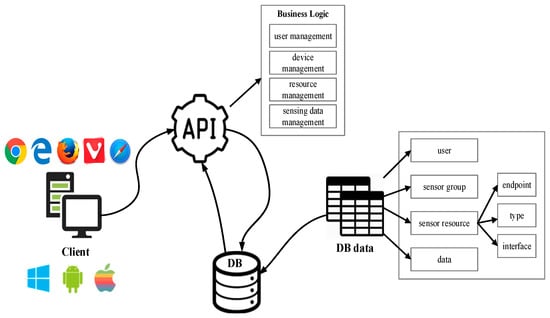The business logic of the cloud-based web application as shown in Figure 7 is basically built on heterogeneous web APIs, which are synonymous with online web services that client applications can use to retrieve and update data. A web API, as the name suggests, is an API over the web which can be accessed using HTTP. Processing tasks can be executed by requesting these APIs in the cloud. The business logic contains various web APIs such as user management, device management, resource management, and sensing data management. Each client application utilizes the same API to get, update, and manipulate data in the database. For example, users can perform read and write operations to a virtual sensor by calling the read and write APIs. In addition, user can retrieve the details of the virtual sensor or send requests for getting sensing data without requiring much knowledge about the specification of physical sensors, which significantly lowers the training requirements for the general public. As an open source architecture, the developer can extend his own module according to the requirements of applications and runtime environments.