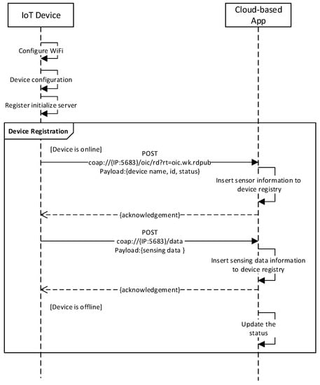 The execution sequence between the IoT device and a cloud-based application is described in Figure 8. The IoT device connects to WiFi so that the local router assigns an IP address to the server, and meanwhile configures the resources of the physical sensors as part of the server. The server inserts the device profile (name, ID, status) into the request payload and requests the cloud to upload the profile using the POST method. This information is stored in the device registry of the cloud application, and a response acknowledge message is generated by the cloud to inform that the device information was successfully registered. After registering to the cloud, the IoT device reads sensing data from physical sensors and uploads the data to the cloud. The cloud sends back a response acknowledge message to inform the device that the sensing data was uploaded. However, if the device goes wrong, such as losing the network connection, the device status value will turn into inactive, therefore, the device stops uploading the sensing data until it reconnects to the cloud. Hence, this process is implemented as a cycle process as the device status might change with time.