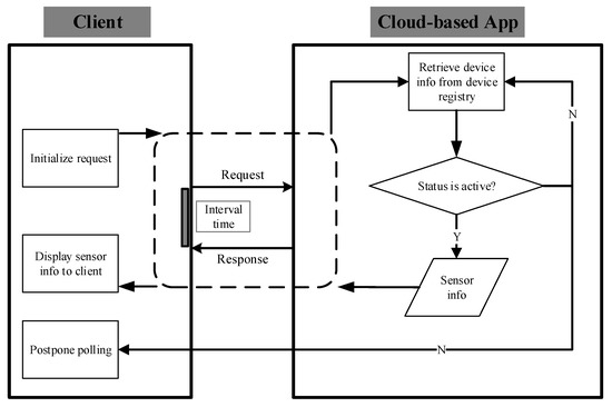 Figure 9 proposes the virtual sensor-based detection mechanism with the architecture. Our concept is to monitor the status of virtual sensors and decide whether to continue showing updates and keep communications open between the client and the cloud-based application or to postpone them when the virtual sensors are not available. To implement this solution, we utilize one of the real-time techniques, so-called polling, to apply our concept, as it benefits from JavaScript features for providing advanced front-end user experience. Polling [64] is a time-driven technique that sends the client request to the cloud application at regular and frequent intervals (e.g., every second) to check whether an update is available to be sent back to the browser. The client initializes a request to the cloud-based application within the specified interval time that should be defined in terms of different scenarios. The application receives the request and retrieves the information from the device registry to check whether the device status is active or not. If the status is active, the application pushes the sensor information to the client, whereas it calls the postpone function when devices are inactive, to suspend sending requests to the cloud application provisionally.