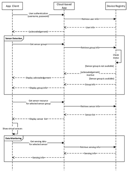 Figure 10 illustrates the various operation processes between the client and the cloud-based application. The user profile including username and password is submitted to the cloud for identity authentication. If authentication succeeds, the cloud returns the success message to the client and allows the user to access the system. The client can request the cloud for information from a sensor group, and the cloud decides whether the request can be responded to depending upon the status of the sensor group. If the sensor group status is active, the cloud provides the sensor group information to the client. The user can retrieve detailed information from the sensors from the group, and the cloud provides the sensor information which is visible to the client. Furthermore, the user can get the sensing values of a specific sensor by a single click, and then the cloud continuously feedbacks the behaviors and readings of the selected sensor.