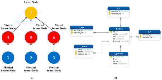(a) Hierarchical virtual sensor topology; (b) data objects of virtual sensors.