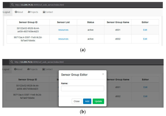 The client initializes a request to the cloud application for obtaining the information of available sensor groups after the end user is authenticated by the system. In this system, the status of the virtual sensor group is synchronous with the related physical counterpart, through which the status of the physical sensors can be remotely informed to the end user without requiring any on-site inspections. The cloud application checks the status of the virtual sensor group from the device registry at each minute, and returns the information of the sensor group if the status value is active. Figure 14a represents the snapshot of the sensor group dashboard which includes the sensor group ID, sensor list, status, and name. The dashboard provides an entry to access all the sensors belonging to the selected group and an editor which enables users to update, create, and delete the sensor group. For instance, the user can modify the properties of the sensor group as shown in Figure 14b, and after confirming the operation, the request is sent to the cloud and the dashboard will be updated accordingly.