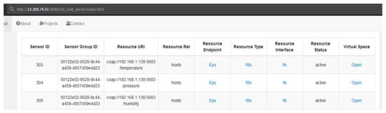 The detailed sensor dashboard shown in Figure 15 depicts the descriptions of each virtual sensor from the selected sensor group along with properties such as sensor ID, resource URI, endpoint, type, interface, and status. Each line in the dashboard represents a resource that encapsulates the complete information regarding a virtual sensor.