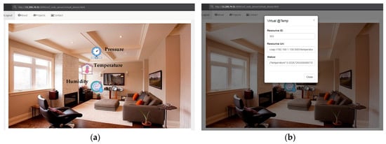 Figure 16a represents the overview of the smart space in web, where a graphical representation is presented for each virtual sensor located in different zones of the home. Once the virtual sensor obtains a request from the end user, the virtual sensor forwards the request to the cloud-based application. A data object mentioned in the implementation details section is created at the back-end, and then the cloud application retrieves the request URI of the virtual sensor from the data object so that the application can communicate with the corresponding physical sensor in the network. The physical sensor provides the sensing data, which is then parsed to the virtual sensor accordingly. The process of reading sensing data from the temperature sensor is illustrated in Figure 16b, where the temperature sensor is clicked to display a pop-up displaying the current readings of the indoor temperature.