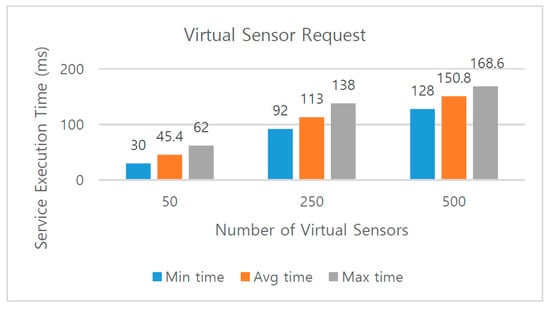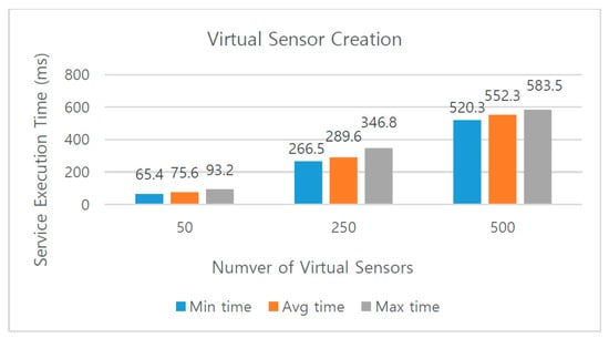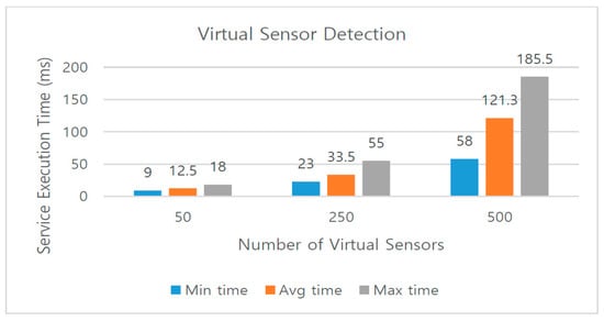 This section illustrates the evaluation results to comprehensively assess the performance of the proposed sensor-cloud platform. We evaluated the service execution time for a different number of virtual sensors under three cases. The first case corresponding to the costing time to create virtual sensors on the cloud-based web application, the second one to the time spent on detecting virtual sensors, and the last one to the time required to initialize the request to the virtual sensors. The first case was analyzed for performance and the results are displayed in Figure 17. For this analysis, three sets of 50, 250, and 500 virtual sensor information was provided to the proposed platform, and each set of virtual sensor information was allowed to be ingested by the platform ten times at randomly selected system resource utilization levels.