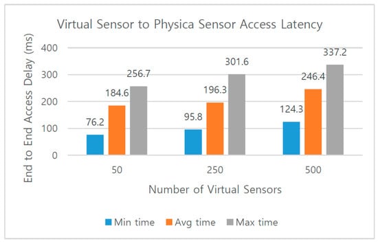 Figure 20 measures the end-to-end access latency performance with variations of increasing numbers of virtual sensors. The end-to-end access latency means the time needed for a request to be transferred from the virtual sensor to the target physical sensor in the network. It is obvious to see from the graph that the access latency raises as the number of virtual sensors grows. The minimum, average, and maximum delay time in ms taken by the proposed platform to access the physical sensors were recorded twenty times at randomly selected system resource utilization levels. For the worst-case performance with 500 virtual sensor information set, the minimum delay taken in the twenty iterations was recorded to be 124.3 ms, averaging at 246.4 ms, and the maximum delay was recorded to be 337.2 ms. The measured end-to-end latency of the dataflow was controlled in an acceptable range and maintained under the 400 ms, which denotes that the proposed system has the ability to assure high efficiency of the end-to-end access latency.
