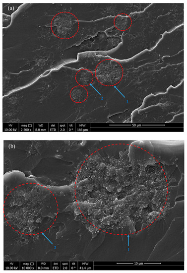 The dispersion of MWCNTs in the epoxy resin was validated using SEM images. SEM pictures of the fracture surface of the nanocomposite specimens were taken after the tensile test. In Figure 6a,b, SEM images of nanocomposites containing 2 wt % MWCNTs at lower and higher magnifications with 5 min dispersion time are given. The highlighted circles in Figure 6a,b mark agglomerated zones of MWCNTs in the epoxy matrix. When compared to the scale given at the lower right corner of the images, it can be seen that the size of the highlighted zones is between 10 and 20 µm (see Figure 6b). However, high degrees of agglomeration have to be avoided when preparing MWCNT composites, agglomeration zones of diameters larger than 10 µm are required to achieve a sufficient conductivity. Additionally, we observed a nearly uniform distribution of MWCNTs in the epoxy matrix with increasing dispersion time and weight percent (see Figure 6c).