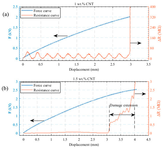 Consequently, the specimen with 3 wt % with 10 min dispersion time is more sensitive than the others (see Figure 9) given the chosen measurement setup. These results are also further consistent with the SEM image of the nanocomposite with 3 wt % MWCNT at 10 min dispersion time (see Figure 6c). This filler amount is also determined to be the percolation threshold as elaborated in Section 3.1. In comparison to the specimens including 1 and 2 wt % MWCNT, the slope of the resistance changes diagram for the specimens with 3 wt % MWCNTs also exhibits a smoother shape. Georgousis et al. [36] reported that the highest sensitivity can be achieved close to the percolation threshold. In the present study, we confirm these results showing that the smoothest curves are achieved above the percolation threshold. Obviously, the samples below the percolation threshold (1, 1.5, and 2 wt %) can be used for sensing by applying an AC impedance measurement setup and a suitable read-out strategy to correct for the non-smooth curve shape. The employment of specimen with different filler content and dispersion times may be adapted to the application and the sensitivity requirements at certain force and displacement regions.
