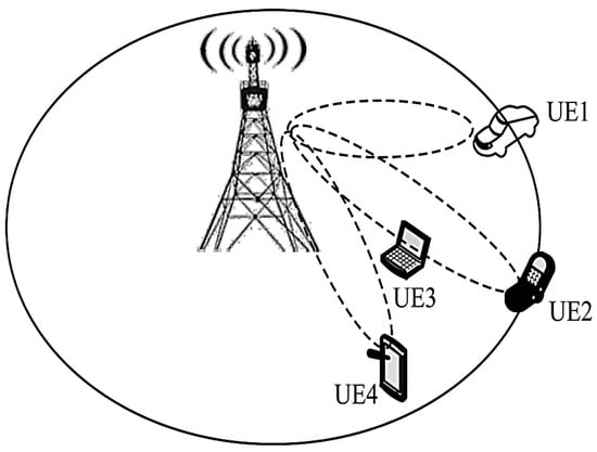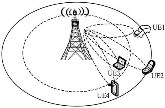 Because the transmission power of the micro base station is low, the macro cell users far away from the micro base station can only obtain a small gain even if the macro base station and the micro base station cooperatively transmit data under the coordinated multipoint (CoMP) mechanism []. Therefore, this article only analyzes downlink information transmission for users in the micro base station. Assuming that the serving base station of each user is the closest base station to it, the micro base station serving the specific user is represented as . Assuming that it is located at the origin, the distance between and is . Then the received sithe gnal can be expressed as: