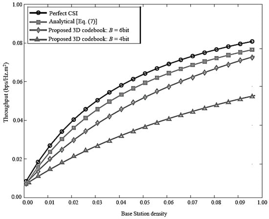 From Equations (16)–(18), the throughput is related to the SNR at the base station density and the feedback overhead. The quantization error is reflected by the feedback overhead. The greater the feedback overhead, the greater the amount of information received by the base-stations from the user feedback, the smaller the quantization error, the more accurate the beam vector, the smaller the throughput loss, and the better the system performance. This article studies the improved 3D-MIMO precoding scheme.