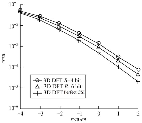 Figure 6 shows how the network throughput varies with the base station density. The proposed 3D MIMO codebook scheme is compared with perfect CSI condition for feedback bits of 4 and 6 respectively. The simulation results are consistent with the analysis results. As the base station density increases, the throughput gradually increases. It can be seen that proper adjustment of the base station density can increase system throughput and optimize system performance. Moreover, as the base station density increases, the impact of system performance caused by incomplete CSI becomes more serious. Furthermore, the system throughput curve when the base station receives perfect CSI is plotted as a comparison, indicating that the more feedback bits, the better the system performance. Figure 7 compares 3D DFT precoding scheme when the number of feedback bits is 4 bits and 6 bits, respectively, and perfect CSI, the BER of the system varies with the SNR of the base station transmitter. Simulation results show that as the number of feedback bits increases, the system’s BER decreases.