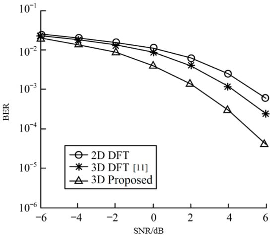 Figure 8 compares the use of DFT precoding schemes in 2D and 3D environments, respectively, under the BER, and in the 3D-MIMO channel model, the performance difference between the improved precoding scheme and the DFT precoding scheme proposed in this paper in terms of system BET. The traditional DFT precoding scheme is not suitable for vertical dimension codebooks in a 3D environment in which the base station employs both planar and planar antenna arrays due to the problem of adjustable dynamic range and vertical distribution of the vertical dip and tilt angle, and this paper considers horizontal emission jointly. The 3D codebook is constructed by angle and vertical down-tilt, so the performance of the improved precoding scheme proposed in this paper is better.