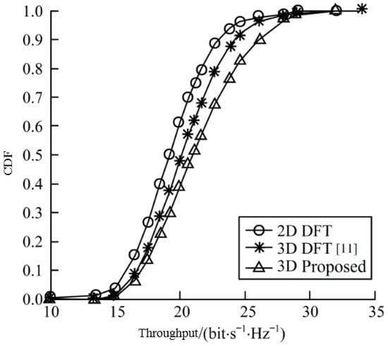 Figure 9 shows the Cumulative Distribution Function (CDF) curves for different codebook schemes. It can be seen from the simulation results that the 3D DFT precoding scheme can effectively improve the system throughput compared to the 2D DFT precoding scheme because it fully utilizes the vertical dimension of the UPA array. The improved 3D precoding scheme proposed in this paper jointly considers the horizontal adjustable range and the vertical down-tilt adjustable range, and considers the specific location of the antenna array elements rather than the UPA array as a whole, so it is more effective. The proposed codebook scheme controls inter-user interference at the edge of the cell to significantly increase system throughput.