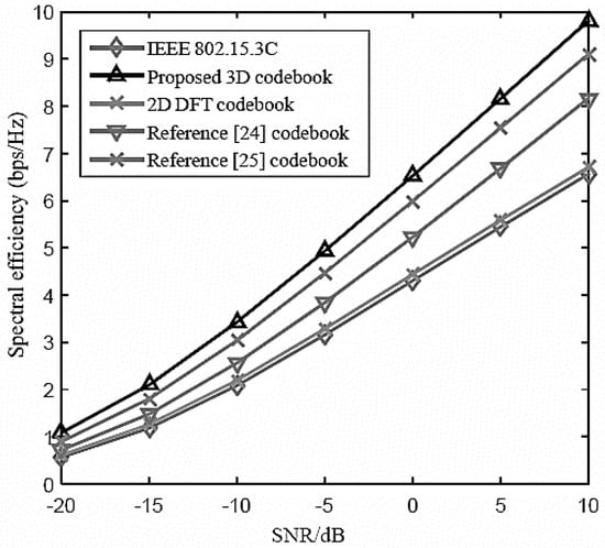 Figure 10 compares the spectral efficiency (SE) versus SNR of the proposed 3D codebook scheme with other state-of-the-art codebook schemes. As can be seen from Figure 10 that the proposed 3D codebook scheme outperforms the other codebook schemes which show its superior performance over other codebooks schemes. Moreover, the rate gap between the proposed scheme and other schemes increases with increasing SNR which means that the proposed 3D codebook scheme shows better SE performance in low as well as high SNR level. Such results cover the real-world aspect of the MIMO system deployment where the SNR changes due to certain channel impairments and there is a need for a flexible and robust codebook scheme which should provide better service in wireless communications systems.
