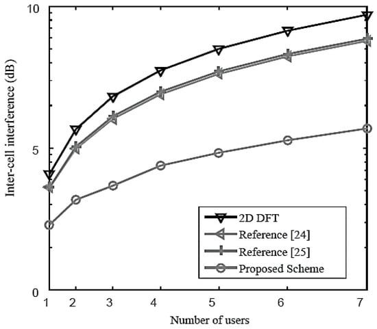 Figure 11 shows the impact of the inter-cell interference on the system using different codebook schemes. As can be seen from the Figure 11, when the number of users increases, the interference from different cells increases which causes communication interruption. Moreover, the proposed 3D codebook scheme shows have lowest Inter-Cell Interference (ICI) level which is much better as compared with those of previous papers [,] and 2D DFT schemes. Therefore, the proposed 3D codebook scheme also shows better ICI performance which obviously makes it an attractive candidate to deploy in real-world application scenarios.