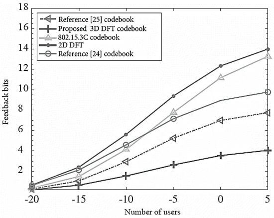 Comparison of feedback bits versus the number of users for the proposed 3D codebook scheme and other state-of-the-art schemes.