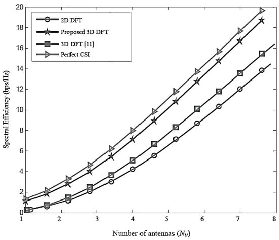 Figure 13 compares the spectral efficiency of the proposed 3D MIMO codebook scheme against the number antennas (Nv) and compares it with other schemes. As can be seen from Figure 13, when the number of antennas increases, the spectral efficiency increases for all codebook schemes. Furthermore, the proposed 3D DFT codebook scheme shows better performance than 2D and 3D DFT [] codebook schemes. It is worth notable from the results that the proposed codebook scheme shows nearly optimal SE performance as its curve is closer to the ideal CSI performance. Therefore, such results show that the proposed codebook scheme have efficient performance in case of a large number of antennas.