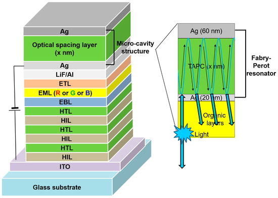 The OLEDs with micro-cavity structure embedded cathodes have the following structure, as shown in Figure 1: ITO/1,4,5,8,9,11-hexaazatriphenylene-hexacarbonitrile (HAT-CN, 10 nm) as a hole-injecting layer (HIL)/1,1-bis((di-4-tolylamino)phenyl)cyclohexane (TAPC, 40 nm) for the red and the blue devices and N,N′-diphenyl-N,N′-bis(1-naphthyl)-1,1′-biphenyl-4,4’-diamine (NPB, 40 nm) for the green device as a hole-transporting layer (HTL)/HIL (10 nm)/HTL(40 nm)/HIL (10 nm)/HTL (40 nm)/4,4′,4″-tris(N-carbazolyl)-triphenylamine (TcTa, 10 nm) as an electron-blocking layer (EBL) for the blue and the green devices/2,6-bis(3-(carbazol-9-yl)phenyl)pyridine (26DCzPPy) doped with bis(2-methyldibenzo(f,h)-quinoxaline) (acetylacetonate) iridium(III) ((MDQ)2Ir(acac), 20 nm) as a red emitting layer (EML), PGH02 [13] doped with GD (20 nm) as a green EML, BH doped with BD (20 nm) as a blue EML/1,3-bis(3,5-dipyrid-3-yl-phenyl)benzene (BmPyPB, 55 nm) for the red device, ETM1 (60 nm) for the green device, and ETM2 (30 nm) for the blue device as an electron-transporting layer (ETL)/lithium fluoride (LiF, 1 nm) as an electron-injecting layer (EIL)/aluminum (Al, 1.5 nm)/Ag (20 nm) as a semi-transparent reflective cathode/TAPC (x nm, x = 100, 110, 120, 130, 140, 150, 160, 170) as an optical spacing layer (OSL)/Ag (60 nm) as an optically reflective layer. The multi-layer structure of HIL/HTL was used to drive the voltage reduction in OLEDs [14]. The thin metal cathode layer of Ag 20 nm may pose a problem for large-sized display panels due to the increase of electric resistance, but it can be sufficiently applied to a small-sized display panel [15].