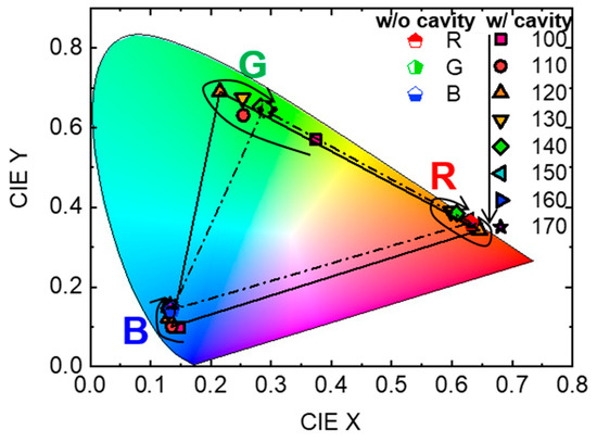 Commission Internationale de L’Eclairage (CIE) 1931 chromaticity diagram with optically simulated colour coordinates and the gamut of R, G, and B devices with (solid line) and without (dash line) micro-cavity structure embedded cathodes.