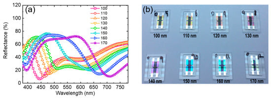 The fabricated OLEDs with micro-cavity structure embedded cathodes have different optical reflectance spectra depending on the OSL thicknesses, as shown in Figure 3a. Consequently, each device has different colours depending on the OSL thicknesses when the device is in an off-state, as shown in Figure 3b. For example, the devices with OSL thicknesses of 100 nm, 140 nm, and 150 nm represent yellow, violet, and blue colours, respectively. This result means that the Fabry–Perot resonator is successfully fabricated and effectively operated depending on the OSL thicknesses.