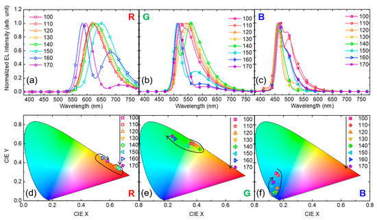Electroluminescence (EL) spectra and CIE 1931 chromaticity diagram with colour coordinates of (a,d) R at 5.4 V, (b,e) G at 4.5 V, and (c,f) B at 4 V OLEDs with micro-cavity structure embedded cathodes depending on OSL thicknesses.