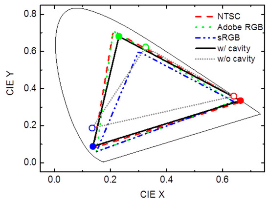 CIE 1931 chromaticity diagram with colour coordinates and the gamut of National Television System Committee (NTSC), Adobe RGB, sRGB, and R (x = 150 nm), G (x = 170 nm), B (x = 140 nm) devices with (solid symbol) and without (open symbol) micro-cavity structure embedded cathodes.