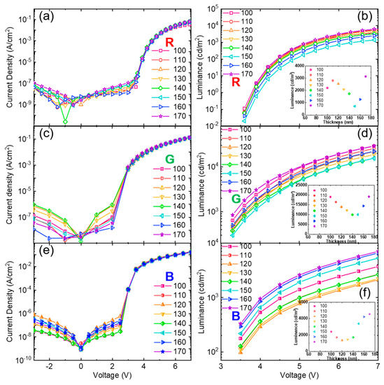Current density–voltage–luminance (J-V-L) characteristics of (a,b) R, (c,d) G, (e,f) B devices with micro-cavity structure embedded cathodes depending on OSL thicknesses. Inset: Luminance of the (b) R, (d) G, (f) B devices at 6 V with different OSL thicknesses.