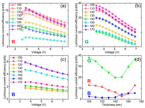 Luminous current efficiency of (a) R, (b) G, and (c) B devices with different voltages and (d) R, G, B devices at approximately 1000 cd/m2 depending on OSL thicknesses.