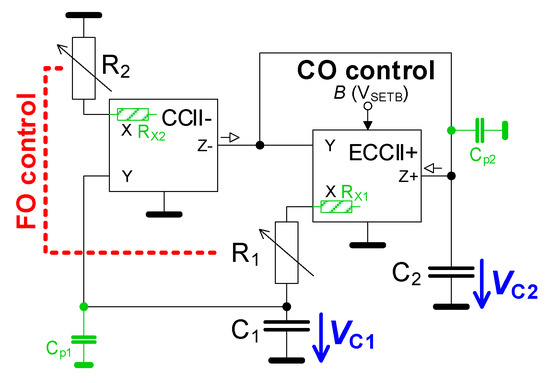 The most important small-signal parasitic effects of real circuitry (indicated by green color in Figure 1) are easily taken into account in a modified form of Equation (1) where the parasitic (stray) nodal capacitances Cp1, Cp2 (in parallel to C1, C2) and resistances RX1, RX2 of the current input terminals (in X of both current conveyors) are considered: