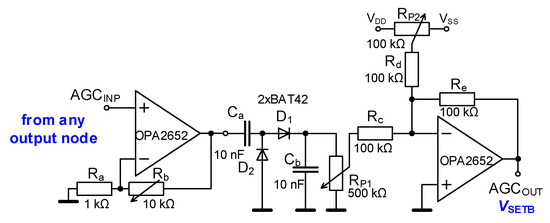 The initial design of this circuit supposes C1 = C2 = C = 47 pF. Note that this selection (tens of pF) is generally required in combination with resistance values (R1 = R2 = R) in hundreds of Ω for the operation of this and similar oscillators above 1 MHz. However, the values of working capacities are not far from the values of stray capacitances of circuitry including the terminal capacities of active devices (units of pF). The internal value of X terminals of CCIIs (RX1,2) must also be taken into account from Equation (5a) and (5c). The current conveyors used in our topology (Figure 1) are established by current-mode multipliers EL2082 [27] and a high-speed single-input single-output transconductance amplifier known also as a diamond transistor OPA615 [28]. The electronically controllable gain B (proportionally driven by VSETB voltage: B ≅ VSETB for VSETB ≤ 2 V [27]; because B ≅ k∙VSETB, where k = 1 [V−1] is valid for VSETB ≤ 2 V) of EL2082 was set to B = 1 for CCII− operation. The cascade of EL2082 with OPA615 (output inversion of CCII−) creates ECCII+ type where B can be controlled to drive the CO by an external AGC for the amplitude stabilization of the generated waveforms (Figure 2). The main purpose of the AGC consists in the sustentation of unchangeable output levels when the oscillator is tuned. This feature cannot be simply obtained when the CO is set to fulfill an analytically obtained relation because energetic (gain) proportions in the circuit are influenced by tunability. The operation without AGC leads to issues with output waveforms (damage of the shape by nonlinear transfer responses of active devices or even limitation), resulting in high total harmonic distortion (THD) (increased level and amount of higher harmonic components and increased level of spurious combination products) or fading (drop down) of oscillations. Voltage buffers (not included in the simplified schemes), based on the OPA2652 [29] operational amplifier, are added to high-impedance nodes for the impedance separation and subsequent measurement of the circuit on a printed circuit board (PCB) by a low-input-impedance (50 Ω) spectrum analyzer HP4395A and oscilloscope Rigol DS1204B.