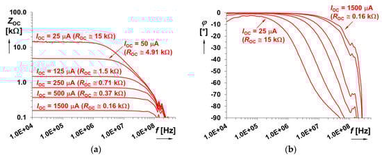 The reasons for the presence of Rm1,2 = 910 Ω and Rpot = 2.5 kΩ result from the required transformation (Rm1,2) of the driving voltage VOC to currents with a maximal allowed value (here approximately 1.5 mA per branch, which is approximately more than 10 times lower current consumption than opamp or CCII per single supply branch, for VOC = 5 V—fully positive supply voltage) and the compensation for the slight inequality of the resulting ROC1 and ROC2 (given by fabrication mismatch) for the same driving current. We compensated this effect by the slight inequality of driving currents (IOC1 ≠ IOC2). The threshold voltage Vth ≈ 1.6 V of the optocoupler’s LED was obtained experimentally. The measured frequency features (by vector network analyzer E5071C) of the optocoupler output (ZOC) are introduced in Figure 4 for particular values. Figure 5 shows the dependence of ROC on the driving current and voltage (in accordance with the driving circuitry in Figure 3). The datasheet [32] does not publish these features, but they must be known for the design of applications. Features of the device limit its implementation to systems operating around 10 MHz when the value of ROC is set below 500 Ω. Based on our experiments, the relation between ROC and the driving current IOC can be found empirically as ROC [Ω] ≅ 0.2/IOC [A]. Then ROC can be approximately expressed, in dependence on the driving voltage VOC, as: