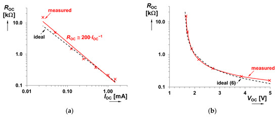 Dependences of FO on: (a) R1,2 (formed by ROC1,2 only or ROC1,2 influenced by RX1,2 = 95 Ω); (b) VOC (traces obtained from ideal, expected, and measured results).