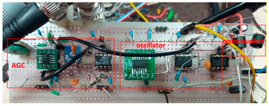There are several reasons for the differences between the ideal, expected, and experimental behaviors (results of frequency dependences on VOC in Table 3 and Figure 6b): (a) parasitic elements (capacities) of the active element due to the close values of the working capacitors to the stray capacitances; (b) transit features of active devices (their phase responses are especially important for oscillators—these issues occur at frequencies lower than −3 dB cut-off or transit frequency); (c) Miller effect of the increasing input capacity of active devices (amplifiers) when the gain is varied—the “parasitic capacity” increases with increasing gain of blocks of the circuit; this behavior is not easily predictable and implementable to the design equations; (d) high uncertainties in bands above 1 MHz given by real parasitic features of the PCB (parasitic conductivity, inductance, and capacity) that can be only approximately estimated in the case of capacity—the accuracy and high-frequency (RF) behavior of circuits operating above 1 MHz highly depends on the design and quality of the PCB; and (e) inequality of the driving current of optocouplers (IOC1 ≠ IOC2).
