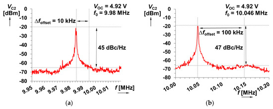 The phase noise evaluation is shown in Figure 12 for VC2 output (these values are actually almost identical for both outputs). The phase noise value was obtained for offset frequency ∆foffset = 10 kHz and 100 kHz (1/1000 and 1/100 of fundamental tone; the oscillator frequency was set to f0 ≅ 10 MHz by VOC = 4.92 V for this test). The phase noise values of 45 and 47 dBc/Hz were obtained for these values of offset frequencies. Note that these are only approximate values due to the limited accuracy of measurement (the noise background is influenced by the resolution-bandwidth (RBW) of the spectrum analyzer that was set to 10 Hz in all cases). The value in the range of 40→70 dBc/Hz is typical for these types of circuits due to the usage of inertial AGC (it solves limitation, shape distortion, THD, and the variation of output levels when f0 is tuned, but its drawback is the higher fluctuation/jitter of output amplitudes). Radio-frequency (GHz)-targeted solutions reach values in the high tens of dBc/Hz (for example >100 dBc/Hz) in dependence on ∆foffset because there is no AGC system in narrow-band tunable oscillators and higher spurious spectral products are filtered. However, this approach cannot be used in base-band or inter-frequency-band oscillators tunable in the f0 range of 10:1 or more. Note that the phase noise and f0 stability (except AGC) also depend on the precision of the construction of the circuit (quality of the PCB, etc.). It may significantly influence overall performances, especially at high frequencies above 1 MHz. The fundamental tone slightly fluctuates in the results shown in Figure 12. The frequency change achieves ±33 kHz (±0.33% at f0 ≅ 10 MHz), which results in a frequency stability of S(f0) = |∆f0/f0| = 6.6 × 10−3 (being within the typical range for active RC oscillators).