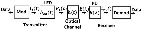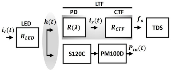Figure 2. It consists of an optical transmitter based on a white light LED and a LTF converter acting as VLC receiver. For convenience, the LTF converter is represented as a two connected subsystems block: a photodiode and a CTF converter.