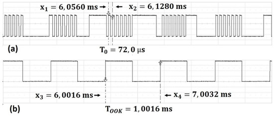 Figure 6a. After free space optical transmission, the OOK signal is detected by an LTF receiver and generates an electrical signal. Then, the electrical OOK signal is converted to frequency by a current-to-frequency converter, as shown in