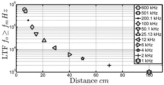 For this evaluation process, the objective is to observe the response of the LTF converter when it is excited by a periodic signal. Using this type of signal is helpful to observe the advantages and disadvantages of using the LTF as a receiver in a VLC system. For this case, the arbitrary waveform generator (AWG) RLGOL DG4162 was used to generate the modulated signal, applied to the base of the 2N3904 NPN transistor, configured in saturation mode, and acting as the driver of the LED. A frequency sweep is then carried out for the modulating signal from 1 kHz until reaching the saturation frequency of the LTF. For each frequency, the separation distance of the link between the transmitter LED and the LTF was changed, from 0 cm up to the distance where the LTF output frequency was greater than or equal to the frequency of the modulating signal, that is, . This limit makes sense from the viewpoint of the frequency generated by the LTF, that is, reaches its maximum value during the half-period in which the modulated signal is in a high state (presence of the optical signal).
