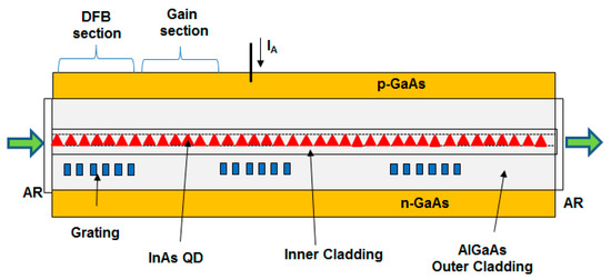 - Tatebayashi, J.; Ishida, M.; Hatori, N.; Ebe, H.; Sudou, H.; Kuramata, A.; Sugawara, M.; Arakawa, Y. Lasing at 1.28 /spl mu/m of InAs-GaAs quantum dots with AlGaAs cladding layer grown by metal-organic chemical vapor deposition. IEEE J. Sel. Top. Quantum Electron. 2005, 11, 1027–1034. [Google Scholar] [CrossRef]