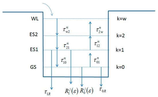 In a separate-confinement heterostructure that has inner- and outer-cladding layers and a QD active layer, the energy-band diagram of the device consists of multiple energy states in the conduction and the valence bands. Experimental data have shown that 1.3 µm InAs/GaAs QD exhibits three energy states in the conduction band and eight energy states in the valence band plus a wetting layer state [11,12]. The separations of the electron and hole energy states are 60 and 10 meV, respectively. For simplicity, k = 0 denotes the ground state, k = 1 denotes the next higher energy state, and k = w denotes the wetting layer state. The energy diagram in the conduction band is shown in Figure 2.