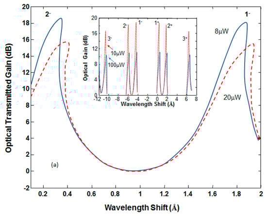 The optical-transmission spectrum of the device displays multiple peaks corresponding to the multiple modes of the sample-grating structure. The optical gain of the device for single input, i.e., no XGM, is shown in the inset of Figure 3. The first 3 dual modes are shown and labeled by , , and in the inset of Figure 3. As evident, the optical-gain spectrum exhibits comb peaks separated by = 1.5 Å between closely adjacent modes like and , and = 4.8 Å between next adjacent modes like and . The unsaturated optical gain is about 50 dB. For input power equal to 10 µW, the comb peaks vary between 17 dB to 18 dB, and, for higher input power, the multiple channels show approximately equal response. Figure 3 shows a zoom in for the optical spectrum for mode and for 8 µW and 20 µW input power. As shown, the peak of mode is 0.3 dB higher gain than mode for = 20 µW, and this gain variation reduces when increases. As evident, increasing the input power () shifts the mode spectrum to higher wavelength. For example, when the input power is very small compared with the input saturation power, mode is peaked at 0.2 Å (i.e., the mode unsaturated wavelength shift is 0.2 Å). When = 20 µW, the wavelength shift that corresponds to the mode peak is increased to 0.4 Å. According to Figure 3, the device modes exhibit spectral bistability at the higher-wavelength side of each mode spectrum. Clockwise spectral hysteresis loops are obtained at specific wavelengths for all comb modes. When increases, the optical gain peak decreases and the spectral hysteresis width increases as well. Operating the device at the wavelengths that correspond to the bistable regions will be useful for multichannel optical switching. We expect that enhanced bistable characteristics will be obtained when cross-gain modulation is presented.