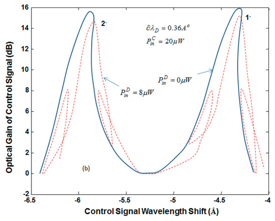 In the following analysis, the bistable characteristics of the device, governed by cross-gain modulation, are studied when multiple input signals are coupled to the comb modes. The data signal is detuned to mode and has its input power fixed at = 8 µW. The control signal, which has an input power of = 20 µW, is detuned to the other comb modes as shown in Figure 4. In Figure 4, we detuned the data wavelength to = 0.36 Å, which places mode at the upper wavelength edge of its bistable region when = 0. The optical gain of the control signal as a function of its wavelength shift is shown in Figure 4. The figure shows the control spectrum for modes and only. According to Figure 4 and as a result of XGM, the data signal significantly modifies the bistable characteristics of the control signal. When = 0 (i.e., without XGM), the control bistability region is located at the upper wavelength side of each mode, as shown by the solid line in Figure 4, and when = 8 µW (i.e., with XGM), the control signal exhibits two wider regions of bistabilities; one is located at the upper wavelength side and the other is located at the lower wavelength side, as shown by the dash line in Figure 4. This is attributed to an overlap between the control- and data-bistability regions and due to coupling between the control and data signals. Under the effect of XGM, we find that the bistability characteristics of mode are different from those of mode . In the following analysis, we will show that the bistable characteristics of mode are approximately similar to those of mode . This is attributed to the fact that modes and , which are separated by one spectral period, exhibit approximately similar spectral gain and similar power dependence. The optical gain of the data signal is shown in Figure 5 as a function of . As evident, the optical gain of the data signal as well as its bistable regions can be controlled by detuning ; detuning to mode and is only shown in the figure. We find that detuning the control wavelength to mode provides different hysteresis width and shape compared with mode . Modes that have similar power dependence exhibit similar bistable characteristics. According to Figure 5, 16 dB contrast ratio can be obtained by operating the device at = −4.1 Å or −5.6 Å.